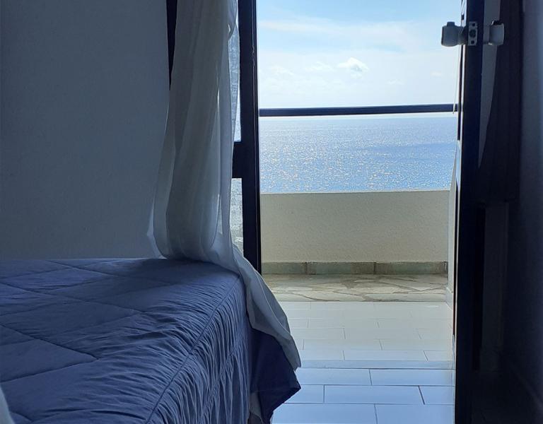Offers new mattresses, a compact kitchenette (suitable for breakfast or light meals), and a semi-private balcony with beautiful sea views. The room is located on the fourth floor, but can also be accessed via our second parking area, just one flight of stairs up.
