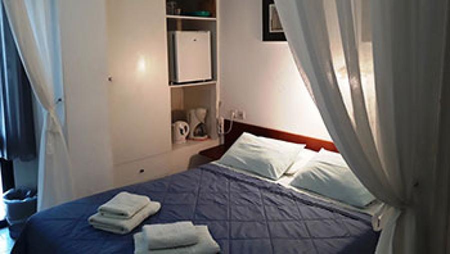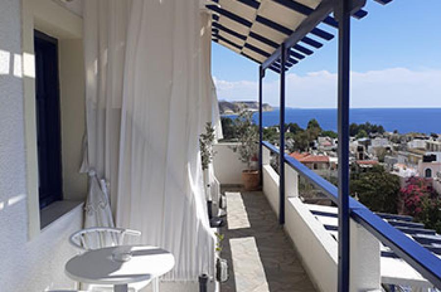 Offers new mattresses, a compact kitchenette (suitable for breakfast or light meals), and a semi-private balcony with beautiful sea views. The room is located on the fourth floor, but can also be accessed via our second parking area, just one flight of stairs up.